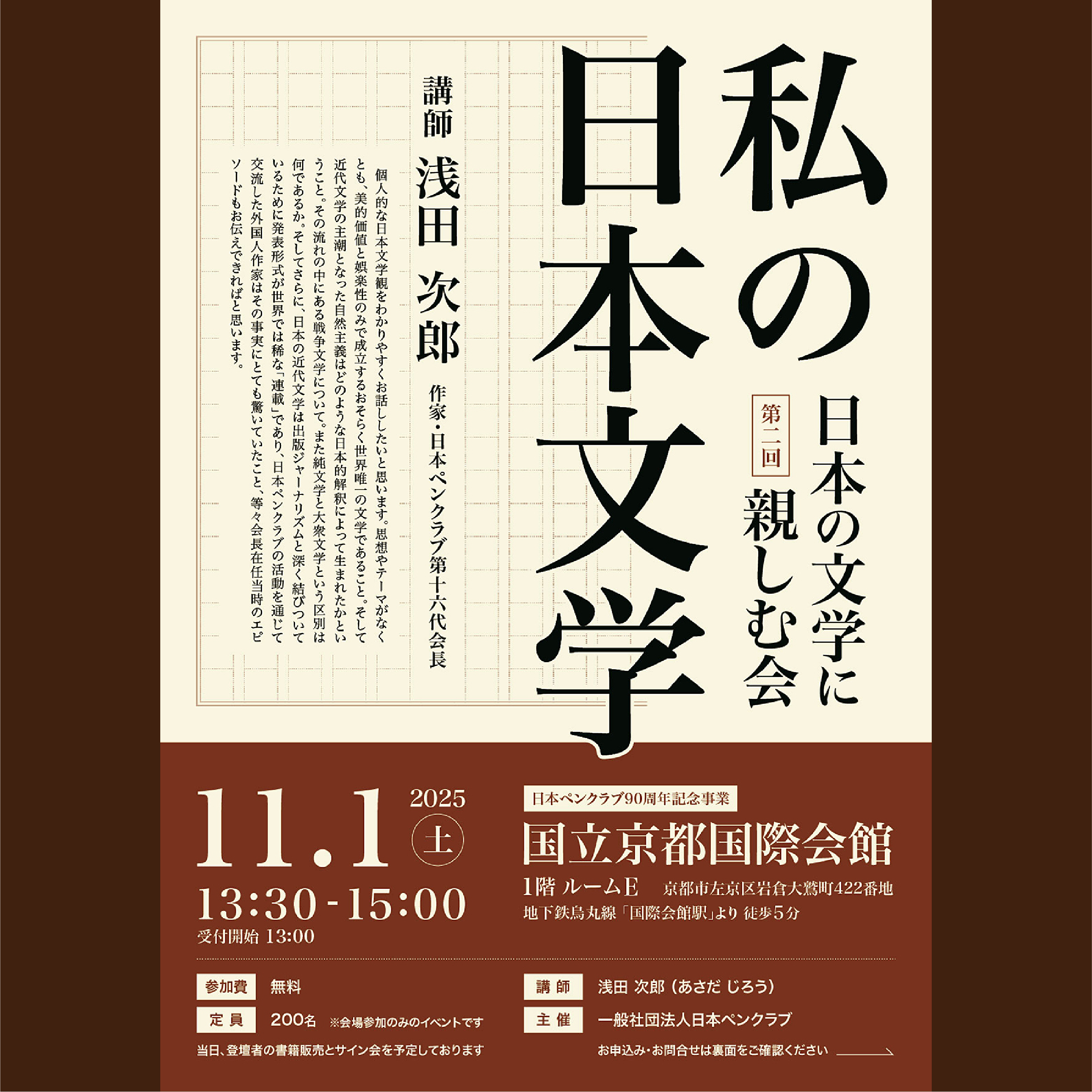 11月1日は京都国際会館にて、日本ペンクラブ京都例会が開催されました。 先ずは、「私の日本文学」について、浅田次郎さんのご講演。 ペンの会員の他、一般の方々も併せて満員のお客様でした。 その後懇親会が盛大に行われました。…