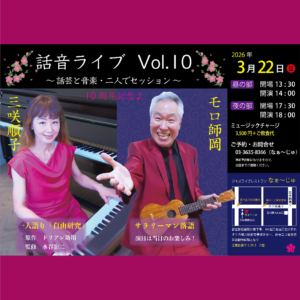 3月22日(日)なぁ〜じゅにて、昼夜2回公演、俳優・モロ師岡さんと話音ライブを開催します。 この度記念すべき10回目、楽しい内容で、皆さまのご来場を心よりお待ちしておりますね🎵 三咲 〜 …